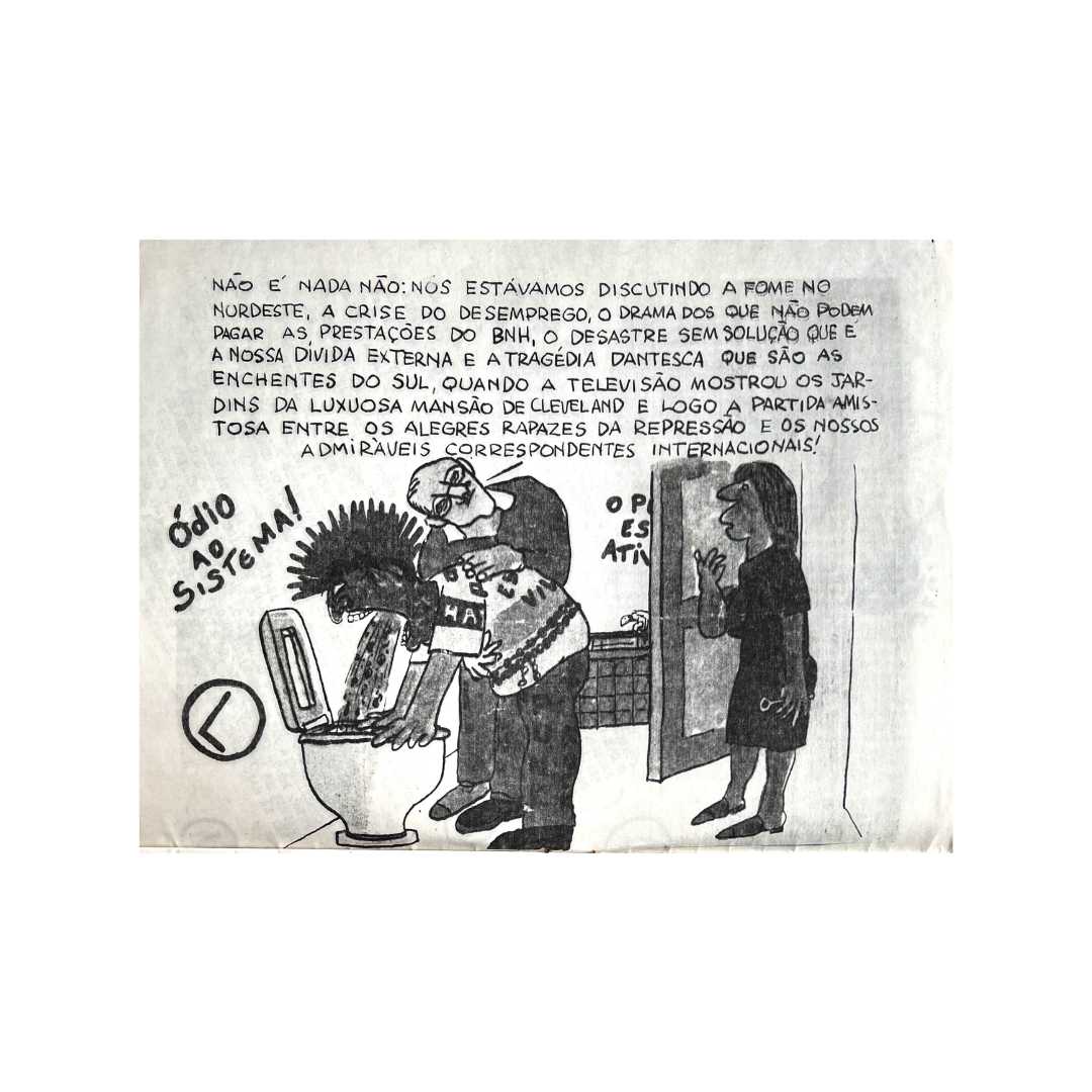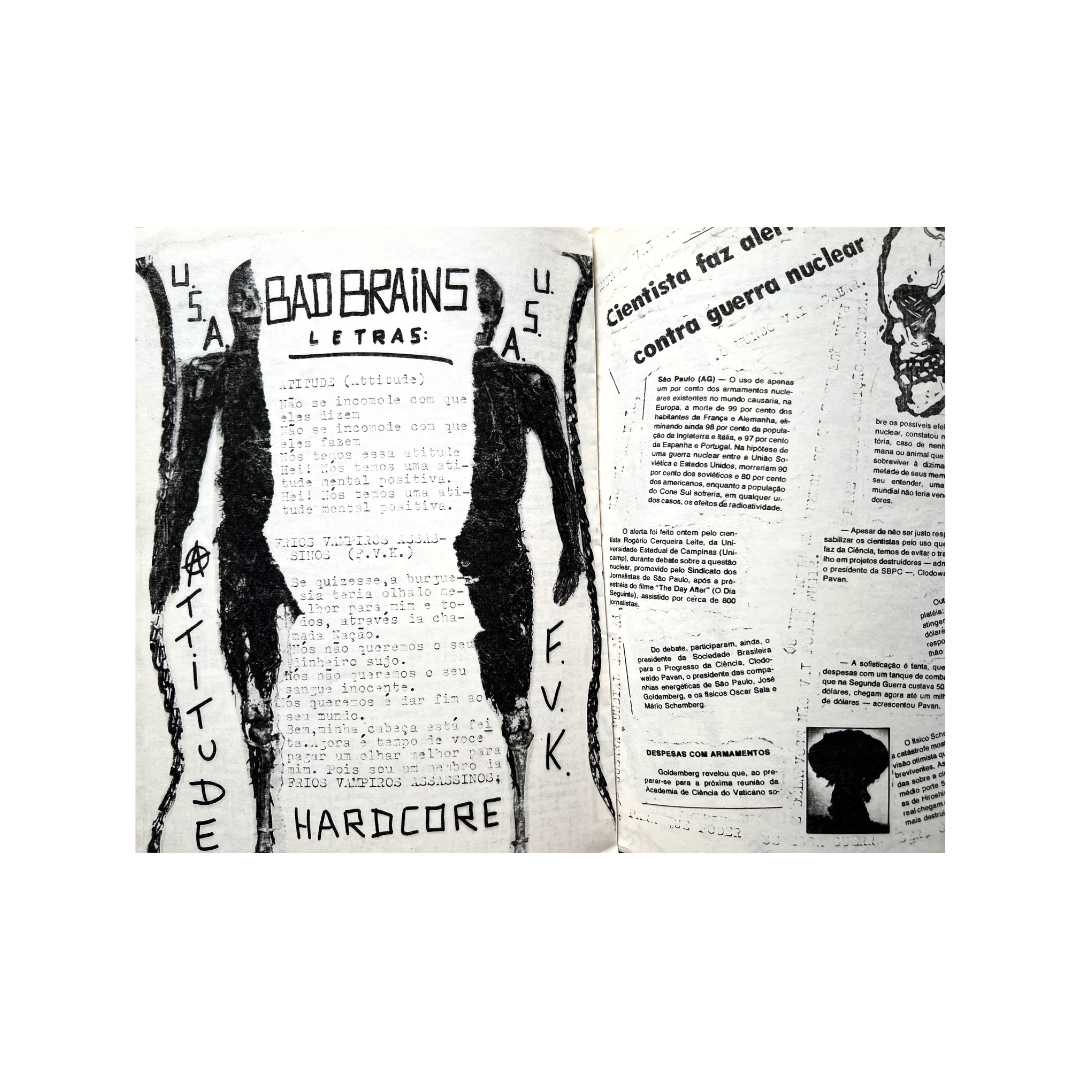 Brazilian anarcho hardcore punk zine circa 1984! Title means "screaming". Otherwise, I can't read it, but it has cool political art, an interview with the Bad Brains, and interviews with Apocolito, Ultimado, Saturados, and Malatesta. Type is that super faded, almost illegible typewriter that just adds to its charm. Back two pages have a slice going down half the page, as if they were victims of a box cutter during a botched box opening. Otherwise, item is in very good shape.