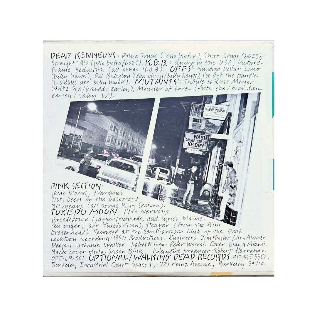 A document of the Deaf Club, San Francisco’s unique venue where the punks and the deaf community mingled. Obviously noted for the great bands, I’m even more obsessed with the back cover photo of a street scene on Valencia St. from 1980. A previous owner of this LP has accentuated the lights on the police cars with a fluorescent pen, and I for one think it’s an improvement. Includes insert, and both cover and record are in excellent condition.