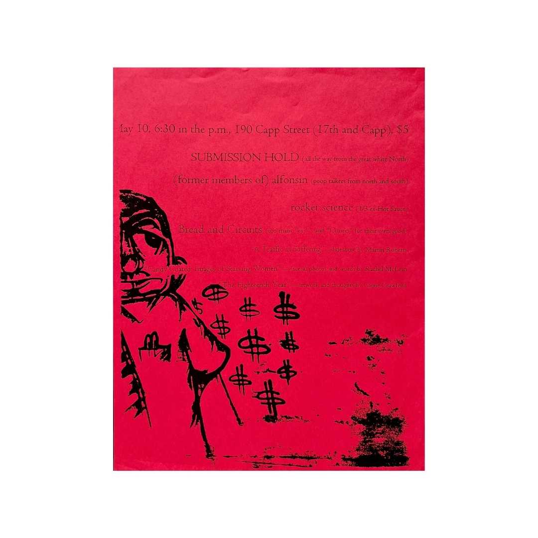 Circa 2000 hardcore show with Canada's Submission Hold, plus domestic bands (Former Members of Alfonsin), Rocket Science, and Bread and Circuits. This flyer is notable for its use of Barry McGee's mural art, likely purloined from a recent bombing. Near fine condition, an obscurity among Barry McGee items.