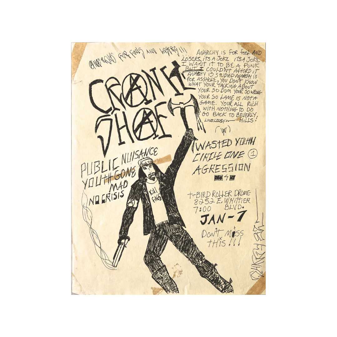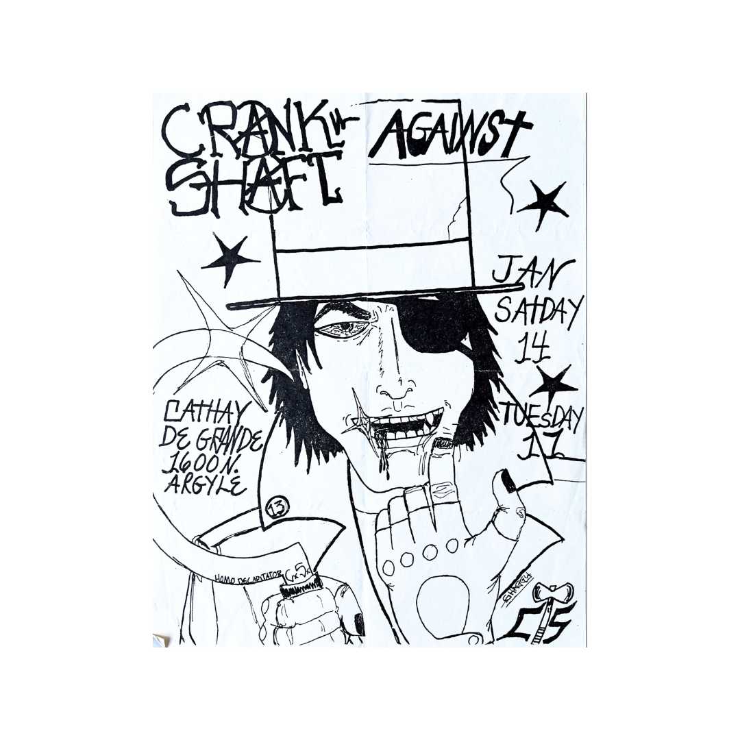 Early 80s LA hardcore band Crankshaft doesn't ring a bell for many people, but their flyers manage to provoke. Drawn by someone in their circle named Shaggy circa 1982, they usually feature crude, violent characters. The best part is when they go full homo-hate. I've seen a few of their flyers now, and will never forget their classic "Decapitated Homo" outing - simply unmatched. However, of these three installments, we have two contenders that at least revisit this fertile ground.
